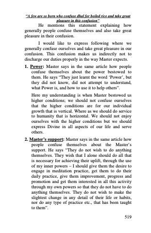 2. Master’s support: Master says in the same article how people confuse themselves about the Master’ s support. He says “They do not wish to do anything themselves. They wish that I alone should do all that is necessary for achieving their uplift, through the use of my inner powers – I should give them the desire to engage in meditation practice, get them to do their daily practice, give them improvement, progress and promotion and get them interested in all this activity through my own powers so that they do not have to do anything themselves. They do not wish to make the slightest change in any detail of their life or habits, nor do any type of practice etc., that has been taught to them”.