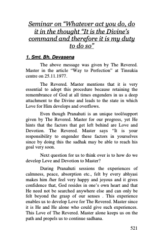 The Revered. Master mentions that it is very essential to adopt this procedure because retaining the remembrance of God at all times engenders in us a deep attachment to the Divine and leads to the state in which Love for Him develops and overflows.