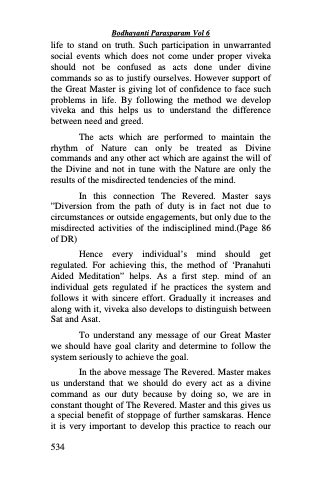 life to stand on truth. Such participation in unwarranted social events which does not come under proper viveka should not be confused as acts done under divine commands so as to justify ourselves. However support of the Great Master is giving lot of confidence to face such problems in life. By following the method we develop viveka and this helps us to understand the difference between need and greed.