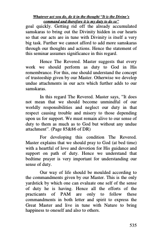 Hence The Revered. Master suggests that every work we should perform as duty to God in His remembrance. For this, one should understand the concept of trusteeship given by our Master. Otherwise we develop undue attachments in our acts which further adds to our samskaras.
