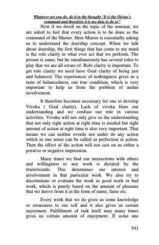 It therefore becomes necessary for one to develop Viveka ( Goal clarity). Lack of viveka blurs our understanding and we confuse our role in various activities. Viveka will not only give us the understanding that not only right action at right time is needed but right amount of action at right time is also very important. That means we can neither overdo nor under do any action which in one sense can be called as perfection in action. Then the effect of the action will not cast on us either a positive or negative impression.
