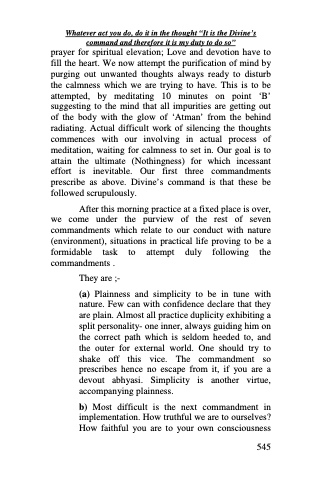 prayer for spiritual elevation; Love and devotion have to fill the heart. We now attempt the purification of mind by purging out unwanted thoughts always ready to disturb the calmness which we are trying to have. This is to be attempted, by meditating 10 minutes on point ‘B’ suggesting to the mind that all impurities are getting out of the body with the glow of ‘Atman’ from the behind radiating. Actual difficult work of silencing the thoughts commences with our involving in actual process of meditation, waiting for calmness to set in. Our goal is to attain the ultimate (Nothingness) for which incessant effort is inevitable. Our first three commandments prescribe as above. Divine’s command is that these be