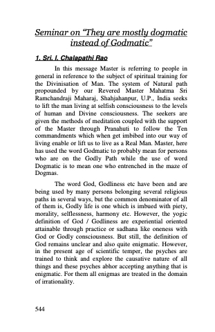 In this message Master is referring to people in general in reference to the subject of spiritual training for the Divinisation of Man. The system of Natural path propounded by our Revered Master Mahatma Sri Ramchandraji Maharaj, Shahjahanpur, U.P., India seeks to lift the man living at selfish consciousness to the levels of human and Divine consciousness. The seekers are given the methods of meditation coupled with the support of the Master through Pranahuti to follow the Ten commandments which when get imbibed into our way of living enable or lift us to live as a Real Man. Master, here has used the word Godmatic to probably mean for persons who are on the Godly Path while the use of word Dogmatic is to mean one who entrenched in the maze of Dogmas.