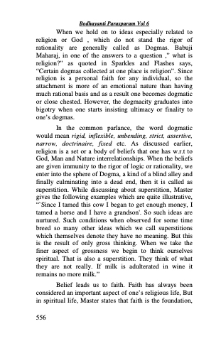 In the common parlance, the word dogmatic would mean rigid, inflexible, unbending, strict, assertive, narrow, doctrinaire, fixed etc. As discussed earlier, religion is a set or a body of beliefs that one has w.r.t to God, Man and Nature interrelationships. When the beliefs are given immunity to the rigor of logic or rationality, we enter into the sphere of Dogma, a kind of a blind alley and finally culminating into a dead end, then it is called as superstition. While discussing about superstition, Master gives the following examples which are quite illustrative, “`Since I tamed this cow I began to get enough money, I tamed a horse and I have a grandson'. So such ideas are nurtured. Such conditions when observed for some time breed so many other ideas which we call superstitions which themselves denote they have no meaning. But this is the result of only gross thinking. When we take the finer aspect of grossness we begin to think ourselves spiritual. That is also a superstition. They think of what they are not really. If milk is adulterated in wine it remains no more milk.”