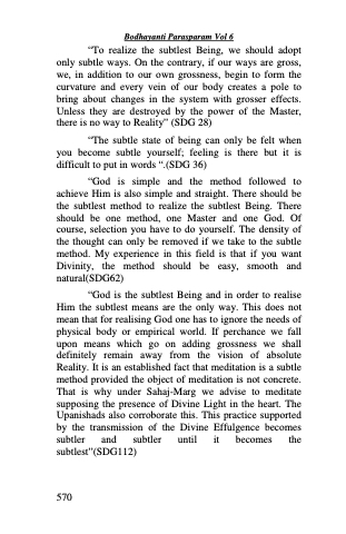“God is the subtlest Being and in order to realise Him the subtlest means are the only way. This does not mean that for realising God one has to ignore the needs of physical body or empirical world. If perchance we fall upon means which go on adding grossness we shall definitely remain away from the vision of absolute Reality. It is an established fact that meditation is a subtle method provided the object of meditation is not concrete. That is why under Sahaj-Marg we advise to meditate supposing the presence of Divine Light in the heart. The Upanishads also corroborate this. This practice supported by the transmission of the Divine Effulgence becomes subtler and subtler until it becomes the subtlest”(SDG112)