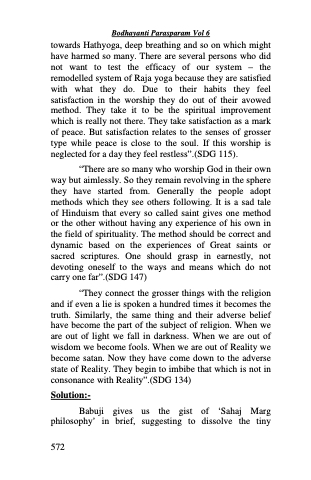 towards Hathyoga, deep breathing and so on which might have harmed so many. There are several persons who did not want to test the efficacy of our system – the remodelled system of Raja yoga because they are satisfied with what they do. Due to their habits they feel satisfaction in the worship they do out of their avowed method. They take it to be the spiritual improvement which is really not there. They take satisfaction as a mark of peace. But satisfaction relates to the senses of grosser type while peace is close to the soul. If this worship is neglected for a day they feel restless”.(SDG 115).