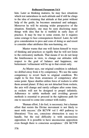 him. Later as thinking matures, he may face situations which test naturalness in such attitude and if still he clings to the idea of retaining that attitude at that point without help of the guide, he becomes unnatural and unhappy. Moreover he will be missing wider perspective of the situation. Similarly, one may be seen disclosing many things with idea that he is truthful in early days of practice. It may be true to some extent, for it requires some courage to face consequences thereof. Later, he will give consideration to pros and cons of doing so and resort to consider other attributes like non-harming, etc.