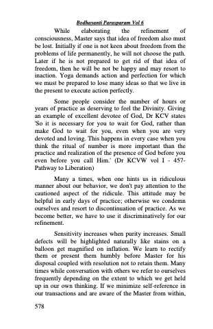 While elaborating the refinement of consciousness, Master says that idea of freedom also must be lost. Initially if one is not keen about freedom from the problems of life permanently, he will not choose the path. Later if he is not prepared to get rid of that idea of freedom, then he will be not be happy and may resort to inaction. Yoga demands action and perfection for which we must be prepared to lose many ideas so that we live in the present to execute action perfectly.