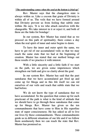 Rev. Master says that the changeless state is always within us. Like a cocoon that grain of Divinity is within all of us. The veils that we have formed around that Divinity prevent us from feeling that subtle state within. He says, ‘It is we who attach ourselves with the changeable. We take interest in it or reject it; and both of these are the links for bondage’.