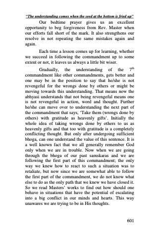 Gradually, the understanding of the 7th commandment like other commandments, gets better and one may be in the position to say that he/she is not revengeful for the wrongs done by others or might be moving towards this understanding. That means now the abhyasi understands that not being revengeful means one is not revengeful in action, word and thought. Further he/she can move over to understanding the next part of the commandment that says, ‘Take them (wrongs done by others) with gratitude as heavenly gifts’. Initially the whole idea of taking wrongs done by others to us as heavenly gifts and that too with gratitude is a completely conflicting thought. But only after undergoing sufficient bhoga, can one understand the value of this sentence. It is a well known fact that we all generally remember God only when we are in trouble. Now when we are going through the bhoga of our past samskaras and we are following the first part of this commandment; the only way we knew how to react to such a situation was to retaliate, but now since we are somewhat able to follow the first part of the commandment, we do not know what else to do as the only path that we knew we have closed it. So we read Masters’ works to find out how should one behave in situations that have the potential of escalating into a big conflict in our minds and hearts. This way unawares we are trying to be in His thoughts.