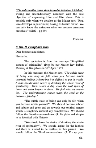 willing and unconditionally surrender with the sole objective of expressing Him and Him alone. This is possible only when we develop as the Master says “Real love develops in purer mind, having its Nature divine. We can only know the unknown when we become unknown ourselves.” (SDG – pg 69).