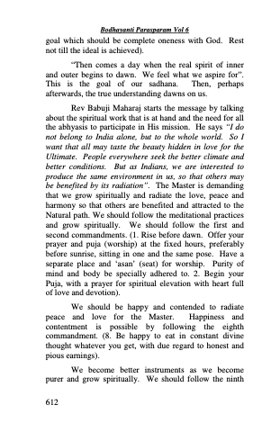 Rev Babuji Maharaj starts the message by talking about the spiritual work that is at hand and the need for all the abhyasis to participate in His mission. He says “I do not belong to India alone, but to the whole world. So I want that all may taste the beauty hidden in love for the Ultimate. People everywhere seek the better climate and better conditions. But as Indians, we are interested to produce the same environment in us, so that others may be benefited by its radiation”. The Master is demanding that we grow spiritually and radiate the love, peace and harmony so that others are benefited and attracted to the Natural path. We should follow the meditational practices and grow spiritually. We should follow the first and second commandments. (1. Rise before dawn. Offer your prayer and puja (worship) at the fixed hours, preferably before sunrise, sitting in one and the same pose. Have a separate place and ‘asan’ (seat) for worship. Purity of mind and body be specially adhered to. 2. Begin your Puja, with a prayer for spiritual elevation with heart full of love and devotion).
