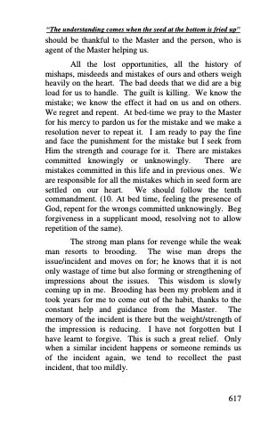 All the lost opportunities, all the history of mishaps, misdeeds and mistakes of ours and others weigh heavily on the heart. The bad deeds that we did are a big load for us to handle. The guilt is killing. We know the mistake; we know the effect it had on us and on others. We regret and repent. At bed-time we pray to the Master for his mercy to pardon us for the mistake and we make a resolution never to repeat it. I am ready to pay the fine and face the punishment for the mistake but I seek from Him the strength and courage for it. There are mistakes committed knowingly or unknowingly. There are mistakes committed in this life and in previous ones. We are responsible for all the mistakes which in seed form are settled on our heart. We should follow the tenth commandment. (10. At bed time, feeling the presence of God, repent for the wrongs committed unknowingly. Beg forgiveness in a supplicant mood, resolving not to allow repetition of the same).