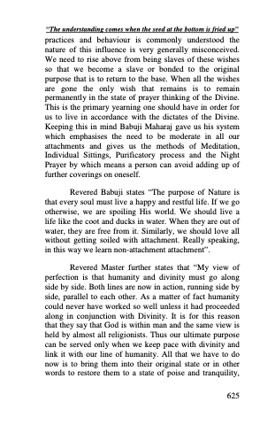 practices and behaviour is commonly understood the nature of this influence is very generally misconceived. We need to rise above from being slaves of these wishes so that we become a slave or bonded to the original purpose that is to return to the base. When all the wishes are gone the only wish that remains is to remain permanently in the state of prayer thinking of the Divine. This is the primary yearning one should have in order for us to live in accordance with the dictates of the Divine. Keeping this in mind Babuji Maharaj gave us his system which emphasises the need to be moderate in all our attachments and gives us the methods of Meditation, Individual Sittings, Purificatory process and the Night Prayer by which means a person can avoid adding up of further coverings on oneself.