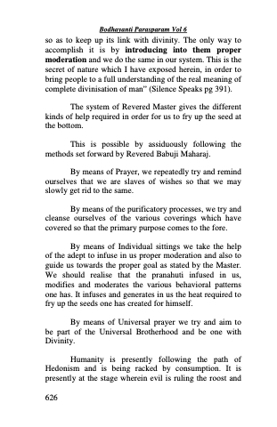 so as to keep up its link with divinity. The only way to accomplish it is by introducing into them proper moderation and we do the same in our system. This is the secret of nature which I have exposed herein, in order to bring people to a full understanding of the real meaning of complete divinisation of man” (Silence Speaks pg 391).