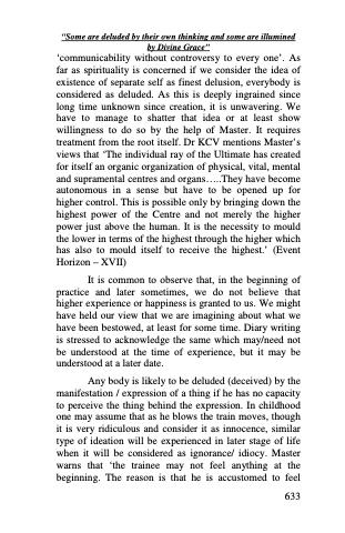 ‘communicability without controversy to every one’. As far as spirituality is concerned if we consider the idea of existence of separate self as finest delusion, everybody is considered as deluded. As this is deeply ingrained since long time unknown since creation, it is unwavering. We have to manage to shatter that idea or at least show willingness to do so by the help of Master. It requires treatment from the root itself. Dr KCV mentions Master’s views that ‘The individual ray of the Ultimate has created for itself an organic organization of physical, vital, mental and supramental centres and organs.....They have become autonomous in a sense but have to be opened up for higher control. This is possible only by bringing down the highest power of the Centre and not merely the higher power just above the human. It is the necessity to mould the lower in terms of the highest through the higher which has also to mould itself to receive the highest.’ (Event