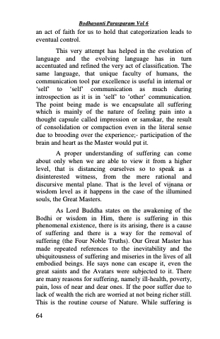 This very attempt has helped in the evolution of language and the evolving language has in turn accentuated and refined the very act of classification. The same language, that unique faculty of humans, the communication tool par excellence is useful in internal or ‘self’ to ‘self’ communication as much during introspection as it is in ‘self’ to ‘other’ communication. The point being made is we encapsulate all suffering which is mainly of the nature of feeling pain into a thought capsule called impression or samskar, the result of consolidation or compaction even in the literal sense due to brooding over the experience;- participation of the brain and heart as the Master would put it.