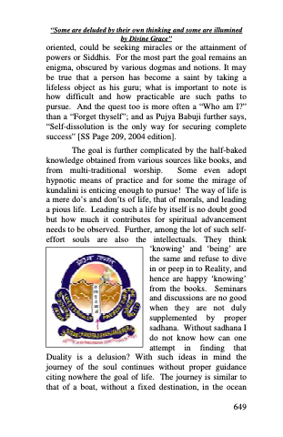 The goal is further complicated by the half-baked knowledge obtained from various sources like books, and from multi-traditional worship. Some even adopt hypnotic means of practice and for some the mirage of kundalini is enticing enough to pursue! The way of life is a mere do’s and don’ts of life, that of morals, and leading a pious life. Leading such a life by itself is no doubt good but how much it contributes for spiritual advancement needs to be observed. Further, among the lot of such self- effort souls are also the intellectuals. They think