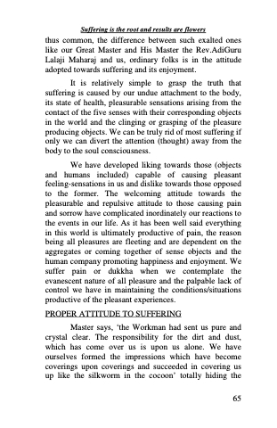 thus common, the difference between such exalted ones like our Great Master and His Master the Rev.AdiGuru Lalaji Maharaj and us, ordinary folks is in the attitude adopted towards suffering and its enjoyment.