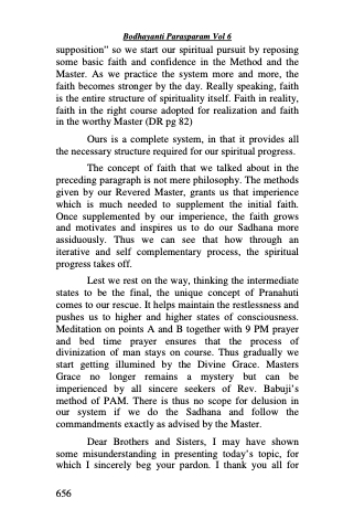 supposition” so we start our spiritual pursuit by reposing some basic faith and confidence in the Method and the Master. As we practice the system more and more, the faith becomes stronger by the day. Really speaking, faith is the entire structure of spirituality itself. Faith in reality, faith in the right course adopted for realization and faith in the worthy Master (DR pg 82)