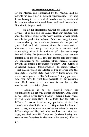 We do not distinguish between the Master and the Divine – it is one and the same. Thus our practice will have the pious Divine touch every moment of our march towards the goal – the Infinite. Whatever we get and/or consume during that march or journey (in the path of grace of divine) will become pious. To a true seeker, whatever comes along the way is a success and encouraging, since it is a divine gift. So, every step forward during the journey is a success, since we are unmindful of the results, for, the actions and the results are consigned to the Master. Thus, success moving towards our goal is a progressive journey. Our journey is an internal journey – transformation – (becoming THAT) – that state in which our Master is. For evolving into the final state – at every state, you have to know where you are and what you are – ‘To find yourself’ at any particular state, you have to ‘first lose yourself’ of the previous state. Each state is a new one in so far as the transformation has taken place.