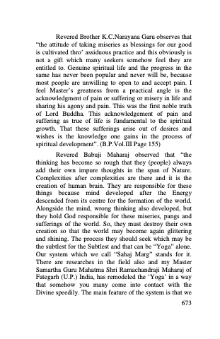 Revered Brother K.C.Narayana Garu observes that “the attitude of taking miseries as blessings for our good is cultivated thro’ assiduous practice and this obviously is not a gift which many seekers somehow feel they are entitled to. Genuine spiritual life and the progress in the same has never been popular and never will be, because most people are unwilling to open to and accept pain. I feel Master’s greatness from a practical angle is the acknowledgment of pain or suffering or misery in life and sharing his agony and pain. This was the first noble truth of Lord Buddha. This acknowledgement of pain and suffering as true of life is fundamental to the spiritual growth. That these sufferings arise out of desires and wishes is the knowledge one gains in the process of spiritual development”. (B.P.Vol.III Page 155)