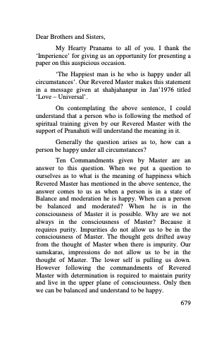 Ten Commandments given by Master are an answer to this question. When we put a question to ourselves as to what is the meaning of happiness which Revered Master has mentioned in the above sentence, the answer comes to us as when a person is in a state of Balance and moderation he is happy. When can a person be balanced and moderated? When he is in the consciousness of Master it is possible. Why are we not always in the consciousness of Master? Because it requires purity. Impurities do not allow us to be in the consciousness of Master. The thought gets drifted away from the thought of Master when there is impurity. Our samskaras, impressions do not allow us to be in the thought of Master. The lower self is pulling us down. However following the commandments of Revered Master with determination is required to maintain purity and live in the upper plane of consciousness. Only then we can be balanced and understand to be happy.