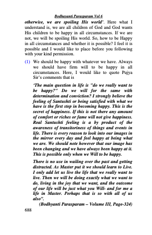 (1) We should be happy with whatever we have. Always we should have firm will to be happy in all circumstances. Here, I would like to quote Pujya Sir’s comments that is