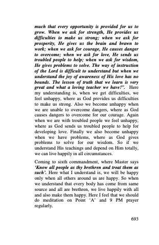 much that every opportunity is provided for us to grow. When we ask for strength, He provides us difficulties to make us strong; when we ask for prosperity, He gives us the brain and brawn to work; when we ask for courage, He causes danger to overcome; when we ask for love, He sends us troubled people to help; when we ask for wisdom, He gives problems to solve. The way of instruction of the Lord is difficult to understand but when we understand the joy of awareness of His love has no bounds. The lesson of truth that we learn is very great and what a loving teacher we have!”. Here my understanding is, when we get difficulties, we feel unhappy, where as God provides us difficulties to make us strong. Also we become unhappy when we are unable to overcome dangers, where as God causes dangers to overcome for our courage. Again when we are with troubled people we feel unhappy, where as God sends us troubled people to help for developing love. Finally we also become unhappy when we have problems, where as God gives problems to solve for our wisdom. So if we understand His teachings and depend on Him totally, we can live happily in all circumstances.