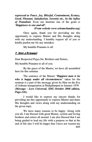 The sentence of the Master “Happiest man is he who is happy under all circumstances” taken for the seminar is a part of the message given by Him on the Eve of Ashram inauguration at Shahjahanpur in January 1976 (Message - Love Universal, SDG October 2006 edition, Page-126).