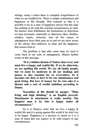 sittings, many a times there is complete forgetfulness of what we are troubled for. There is simple contentment and happiness in His thought. This reminds us that it is possible to be in a state of happiness always but this state has nothing to do with the external circumstances as such, the desires, their fulfillment, the frustrations or dejections we may encounter, materially or otherwise, likes, dislikes, rebukes, taunts, criticism, fear all the causes of unhappiness loose their grip on us and we are more aware of the silence that embraces us deep and the happiness that ensues from it.