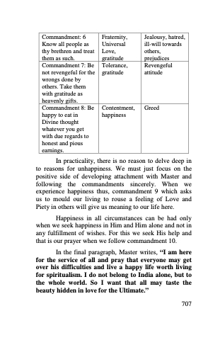 In practicality, there is no reason to delve deep in to reasons for unhappiness. We must just focus on the positive side of developing attachment with Master and following the commandments sincerely. When we experience happiness thus, commandment 9 which asks us to mould our living to rouse a feeling of Love and Piety in others will give us meaning to our life here.