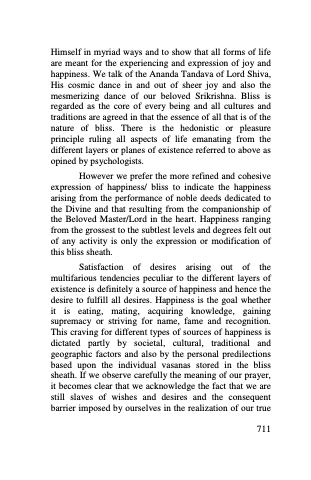 However we prefer the more refined and cohesive expression of happiness/ bliss to indicate the happiness arising from the performance of noble deeds dedicated to the Divine and that resulting from the companionship of the Beloved Master/Lord in the heart. Happiness ranging from the grossest to the subtlest levels and degrees felt out of any activity is only the expression or modification of this bliss sheath.