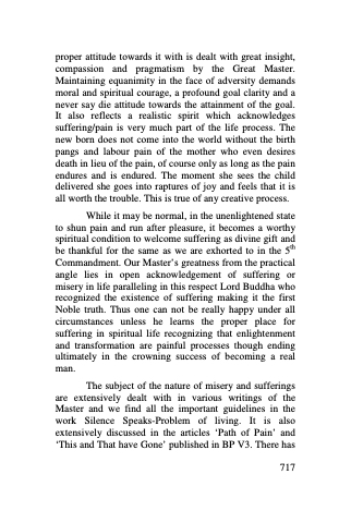 proper attitude towards it with is dealt with great insight, compassion and pragmatism by the Great Master. Maintaining equanimity in the face of adversity demands moral and spiritual courage, a profound goal clarity and a never say die attitude towards the attainment of the goal. It also reflects a realistic spirit which acknowledges suffering/pain is very much part of the life process. The new born does not come into the world without the birth pangs and labour pain of the mother who even desires death in lieu of the pain, of course only as long as the pain endures and is endured. The moment she sees the child delivered she goes into raptures of joy and feels that it is all worth the trouble. This is true of any creative process.