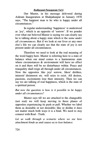 In regular understanding ‘happiness’ is understood as ‘joy’, which is an opposite of ‘sorrow’. If we ponder over what our beloved Master is saying we can clearly say he is talking about a happy state which is the same under all circumstances. But if we look at our lives or any ones else’s life we can clearly see that the state of joy is not present under all circumstances.
