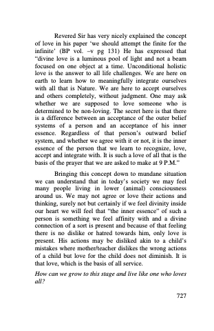 Revered Sir has very nicely explained the concept of love in his paper ‘we should attempt the finite for the infinite’ (BP vol. –v pg 131) He has expressed that “divine love is a luminous pool of light and not a beam focused on one object at a time. Unconditional holistic love is the answer to all life challenges. We are here on earth to learn how to meaningfully integrate ourselves with all that is Nature. We are here to accept ourselves and others completely, without judgment. One may ask whether we are supposed to love someone who is determined to be non-loving. The secret here is that there is a difference between an acceptance of the outer belief systems of a person and an acceptance of his inner essence. Regardless of that person’s outward belief system, and whether we agree with it or not, it is the inner essence of the person that we learn to recognize, love, accept and integrate with. It is such a love of all that is the basis of the prayer that we are asked to make at 9 P.M.”