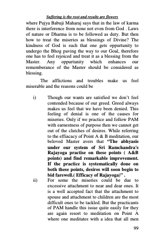 i) Though our wants are satisfied we don’t feel contended because of our greed. Greed always makes us feel that we have been denied. This feeling of denial is one of the causes for miseries. Only if we practice and follow PAM with earnestness of purpose then we cannot get out of the clutches of desires. While referring to the effiacacy of Point A & B meditation, our beloved Master avers that “The abhyasis under our system of Sri Ramchandra's Rajayoga practise on these points ( A&B points) and find remarkable improvement. If the practice is systematically done on both these points, desires will soon begin to bid farewell.( Efficacy of Rajayoga)” .