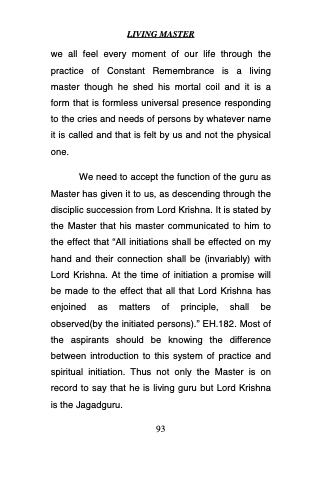 We need to accept the function of the guru as Master has given it to us, as descending through the disciplic succession from Lord Krishna. It is stated by the Master that his master communicated to him to the effect that “All initiations shall be effected on my hand and their connection shall be (invariably) with Lord Krishna. At the time of initiation a promise will be made to the effect that all that Lord Krishna has enjoined as matters of principle, shall be observed(by the initiated persons).” EH.182. Most of the aspirants should be knowing the difference between introduction to this system of practice and spiritual initiation. Thus not only the Master is on record to say that he is living guru but Lord Krishna is the Jagadguru.