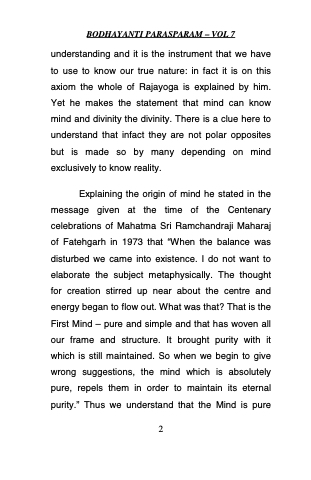 Explaining the origin of mind he stated in the message given at the time of the Centenary celebrations of Mahatma Sri Ramchandraji Maharaj of Fatehgarh in 1973 that “When the balance was disturbed we came into existence. I do not want to elaborate the subject metaphysically. The thought for creation stirred up near about the centre and energy began to flow out. What was that? That is the First Mind – pure and simple and that has woven all our frame and structure. It brought purity with it which is still maintained. So when we begin to give wrong suggestions, the mind which is absolutely pure, repels them in order to maintain its eternal purity.” Thus we understand that the Mind is pure