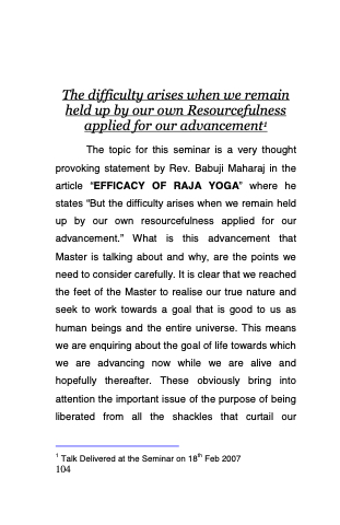 The topic for this seminar is a very thought provoking statement by Rev. Babuji Maharaj in the article “EFFICACY OF RAJA YOGA” where he states “But the difficulty arises when we remain held up by our own resourcefulness applied for our advancement.” What is this advancement that Master is talking about and why, are the points we need to consider carefully. It is clear that we reached the feet of the Master to realise our true nature and seek to work towards a goal that is good to us as human beings and the entire universe. This means we are enquiring about the goal of life towards which we are advancing now while we are alive and hopefully thereafter. These obviously bring into attention the important issue of the purpose of being liberated from all the shackles that curtail our