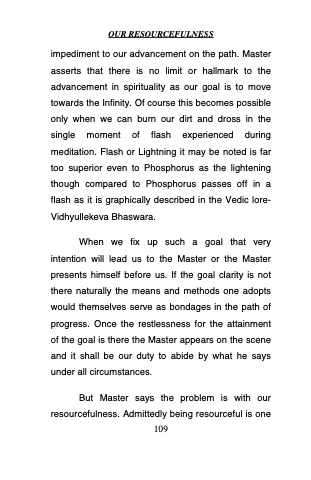impediment to our advancement on the path. Master asserts that there is no limit or hallmark to the advancement in spirituality as our goal is to move towards the Infinity. Of course this becomes possible only when we can burn our dirt and dross in the single moment of flash experienced during meditation. Flash or Lightning it may be noted is far too superior even to Phosphorus as the lightening though compared to Phosphorus passes off in a flash as it is graphically described in the Vedic lore- Vidhyullekeva Bhaswara.