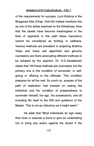 of the requirements for success. Lord Krishna in the Bhagavad Gita (Chap. Xviii-43) indeed mentions this as one of the duties enjoined on the Kshatriyas. Now that the castes have become meaningless in the lives of aspirants in this path these injunctions cannot be considered as binding in sadhana. Various methods are prevalent in acquiring Brahma Vidya and many self appointed and genuine counselors are there advocating different methods to be adopted by the aspirant. Dr. K.C.Varadachari states that “All these methods are counseled, but the primary one is the condition of surrender, or self- giving or offering to the Ultimate. This condition prepares for all the rest. So much so, acaryas of the path of realisation had insisted on seeing the individual and his condition of preparedness to surrender himself, his ego, his possessions, and all including life itself to the Will and guidance of the Master. This is not as ridiculous as it might seem.”