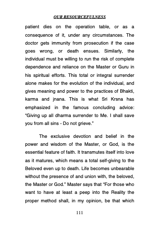 patient dies on the operation table, or as a consequence of it, under any circumstances. The doctor gets immunity from prosecution if the case goes wrong, or death ensues. Similarly, the individual must be willing to run the risk of complete dependence and reliance on the Master or Guru in his spiritual efforts. This total or integral surrender alone makes for the evolution of the individual, and gives meaning and power to the practices of Bhakti, karma and jnana. This is what Sri Krsna has emphasized in the famous concluding advice: “Giving up all dharma surrender to Me. I shall save you from all sins - Do not grieve.”