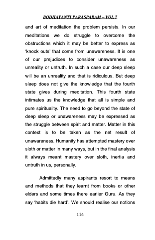 and art of meditation the problem persists. In our meditations we do struggle to overcome the obstructions which it may be better to express as ‘knock outs’ that come from unawareness. It is one of our prejudices to consider unawareness as unreality or untruth. In such a case our deep sleep will be an unreality and that is ridiculous. But deep sleep does not give the knowledge that the fourth state gives during meditation. This fourth state intimates us the knowledge that all is simple and pure spirituality. The need to go beyond the state of deep sleep or unawareness may be expressed as the struggle between spirit and matter. Matter in this context is to be taken as the net result of unawareness. Humanity has attempted mastery over sloth or matter in many ways, but in the final analysis it always meant mastery over sloth, inertia and untruth in us, personally.