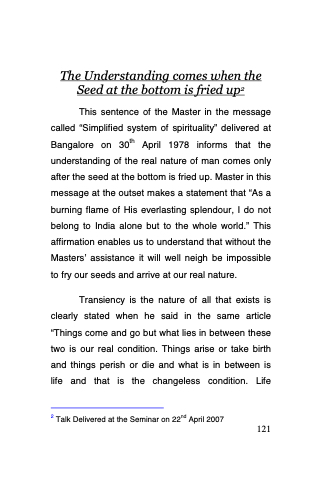 This sentence of the Master in the message called “Simplified system of spirituality” delivered at Bangalore on 30th April 1978 informs that the understanding of the real nature of man comes only after the seed at the bottom is fried up. Master in this message at the outset makes a statement that “As a burning flame of His everlasting splendour, I do not belong to India alone but to the whole world.” This affirmation enables us to understand that without the Masters’ assistance it will well neigh be impossible to fry our seeds and arrive at our real nature.