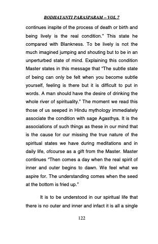 continues inspite of the process of death or birth and being lively is the real condition.” This state he compared with Blankness. To be lively is not the much imagined jumping and shouting but to be in an unperturbed state of mind. Explaining this condition Master states in this message that “The subtle state of being can only be felt when you become subtle yourself, feeling is there but it is difficult to put in words. A man should have the desire of drinking the whole river of spirituality.” The moment we read this those of us seeped in Hindu mythology immediately associate the condition with sage Agasthya. It is the associations of such things as these in our mind that is the cause for our missing the true nature of the spiritual states we have during meditations and in daily life, ofcourse as a gift from the Master. Master continues “Then comes a day when the real spirit of inner and outer begins to dawn. We feel what we aspire for. The understanding comes when the seed at the bottom is fried up.”