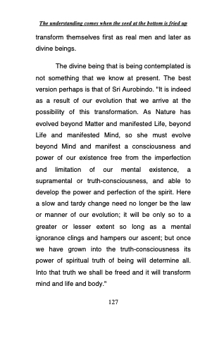 The divine being that is being contemplated is not something that we know at present. The best version perhaps is that of Sri Aurobindo. "It is indeed as a result of our evolution that we arrive at the possibility of this transformation. As Nature has evolved beyond Matter and manifested Life, beyond Life and manifested Mind, so she must evolve beyond Mind and manifest a consciousness and power of our existence free from the imperfection and limitation of our mental existence, a supramental or truth-consciousness, and able to develop the power and perfection of the spirit. Here a slow and tardy change need no longer be the law or manner of our evolution; it will be only so to a greater or lesser extent so long as a mental ignorance clings and hampers our ascent; but once we have grown into the truth-consciousness its power of spiritual truth of being will determine all. Into that truth we shall be freed and it will transform mind and life and body."