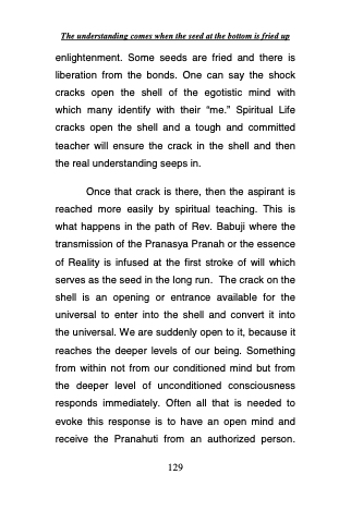 Once that crack is there, then the aspirant is reached more easily by spiritual teaching. This is what happens in the path of Rev. Babuji where the transmission of the Pranasya Pranah or the essence of Reality is infused at the first stroke of will which serves as the seed in the long run. The crack on the shell is an opening or entrance available for the universal to enter into the shell and convert it into the universal. We are suddenly open to it, because it reaches the deeper levels of our being. Something from within not from our conditioned mind but from the deeper level of unconditioned consciousness responds immediately. Often all that is needed to evoke this response is to have an open mind and receive the Pranahuti from an authorized person.