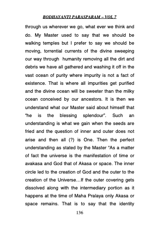 through us wherever we go, what ever we think and do. My Master used to say that we should be walking temples but I prefer to say we should be moving, torrential currents of the divine sweeping our way through humanity removing all the dirt and debris we have all gathered and washing it off in the vast ocean of purity where impurity is not a fact of existence. That is where all impurities get purified and the divine ocean will be sweeter than the milky ocean conceived by our ancestors. It is then we understand what our Master said about himself that “he is the blessing splendour”. Such an understanding is what we gain when the seeds are fried and the question of inner and outer does not arise and then all (?) is One. Then the perfect understanding as stated by the Master “As a matter of fact the universe is the manifestation of time or avakasa and God that of Akasa or space. The inner circle led to the creation of God and the outer to the creation of the Universe...If the outer covering gets dissolved along with the intermediary portion as it happens at the time of Maha Pralaya only Akasa or space remains. That is to say that the identity