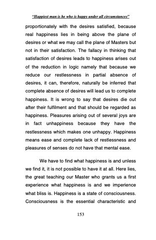 proportionately with the desires satisfied, because real happiness lies in being above the plane of desires or what we may call the plane of Masters but not in their satisfaction. The fallacy in thinking that satisfaction of desires leads to happiness arises out of the reduction in logic namely that because we reduce our restlessness in partial absence of desires, it can, therefore, naturally be inferred that complete absence of desires will lead us to complete happiness. It is wrong to say that desires die out after their fulfilment and that should be regarded as happiness. Pleasures arising out of several joys are in fact unhappiness because they have the restlessness which makes one unhappy. Happiness means ease and complete lack of restlessness and pleasures of senses do not have that mental ease.